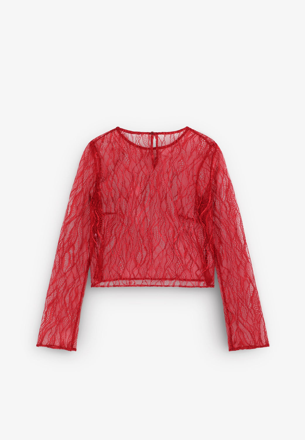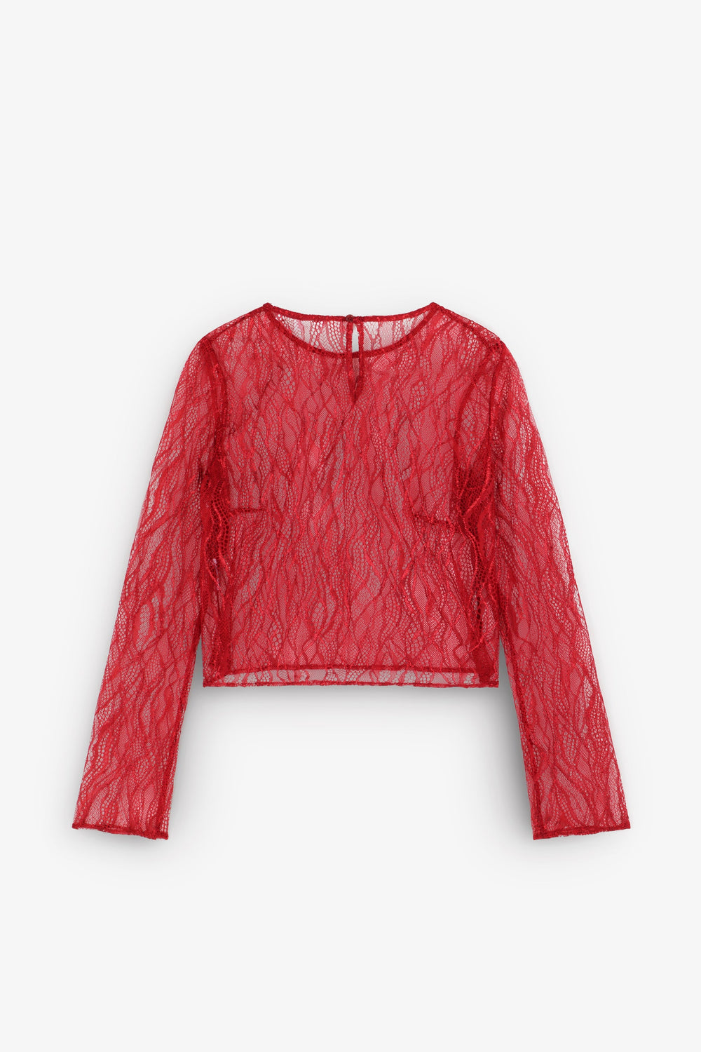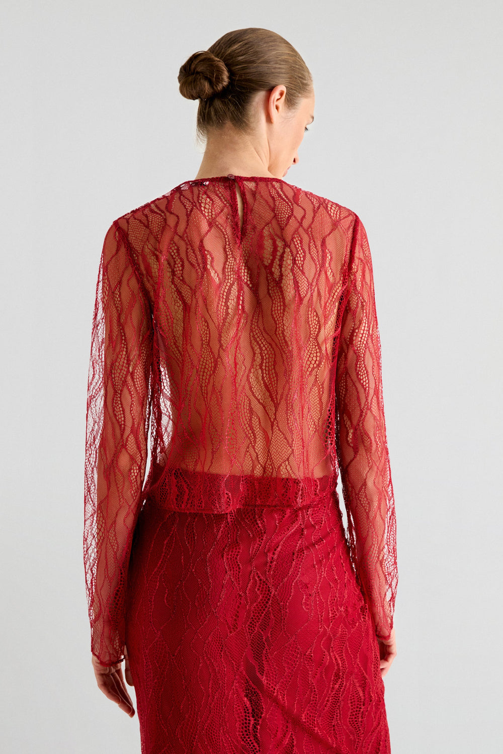 Top semitransparente de encaje. Regular fit, cuello redondo y manga larga. Cierre trasero con botón.