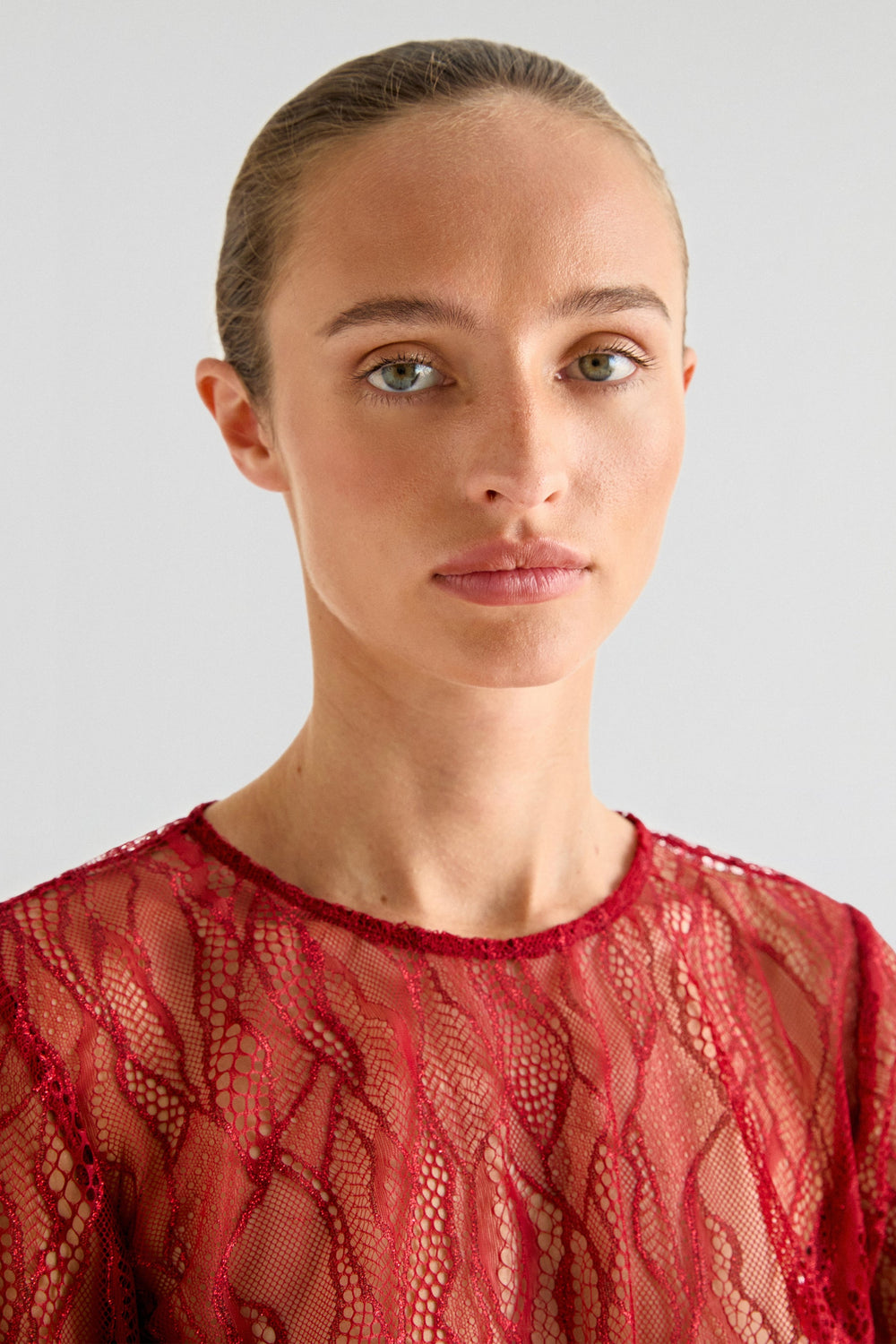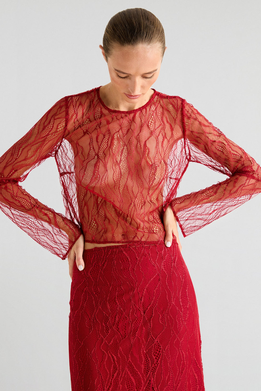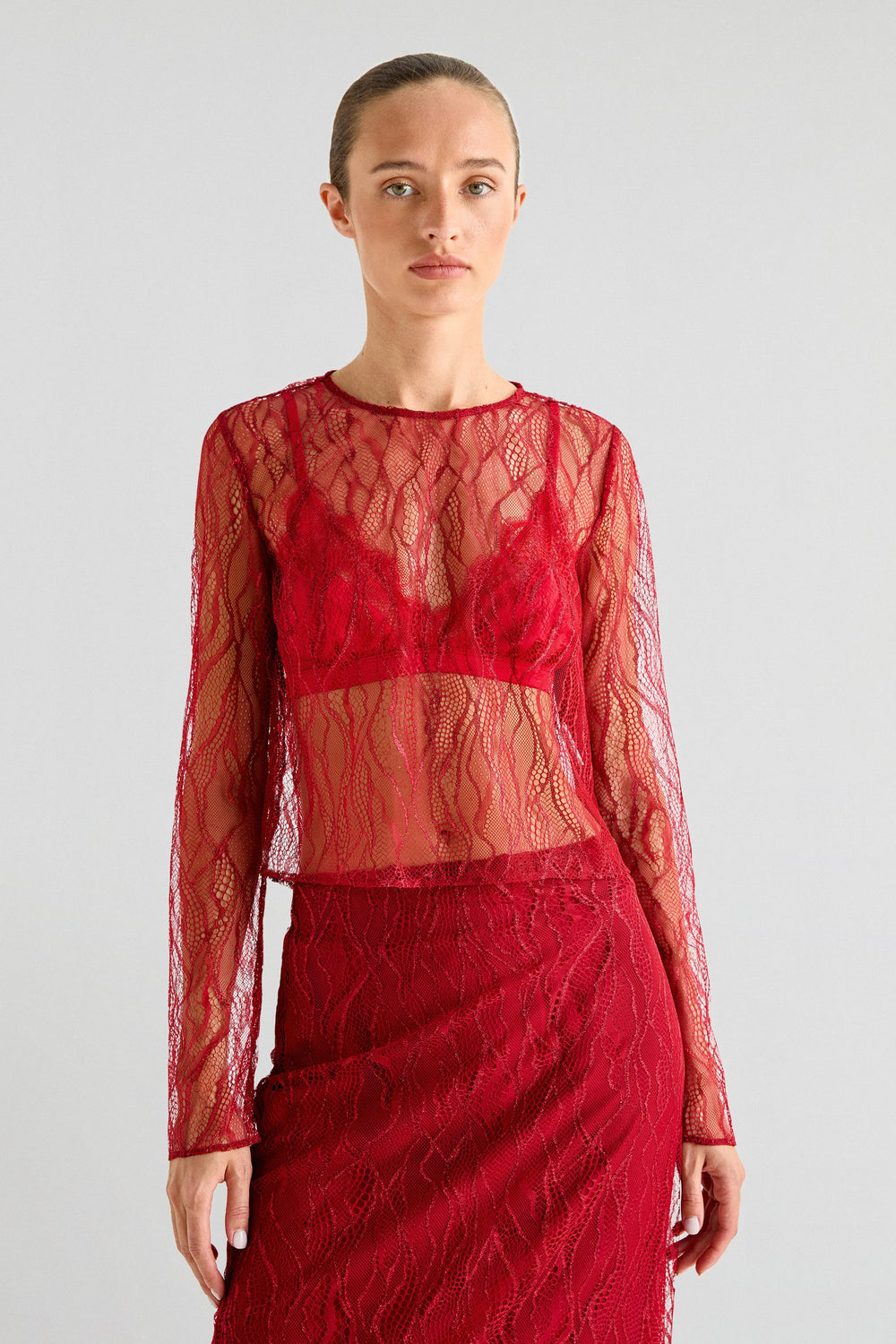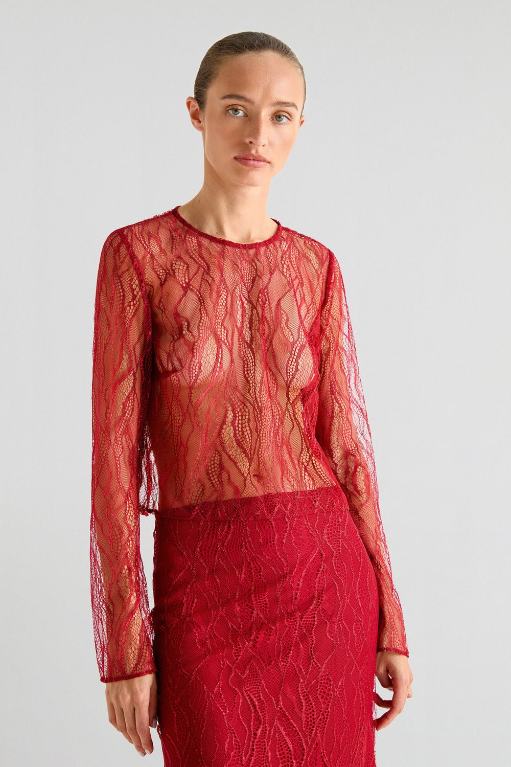 Top semitransparente de encaje. Regular fit, cuello redondo y manga larga. Cierre trasero con botón.