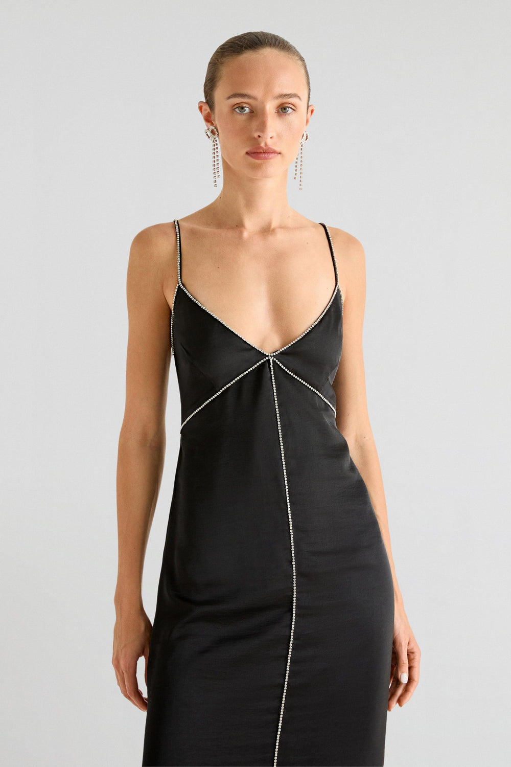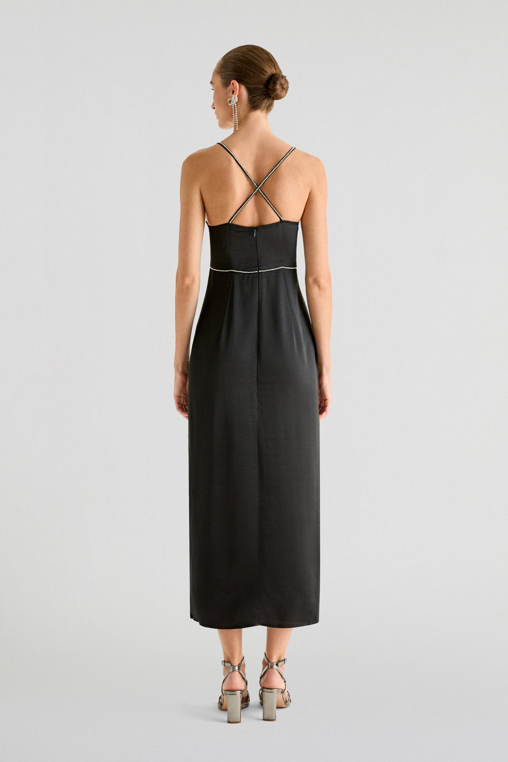 Vestido midi slip confeccionado en tejido satinado. Slim fit, cierre con cremallera y tirantes cruzados en la parte trasera. Detalle de cristales.