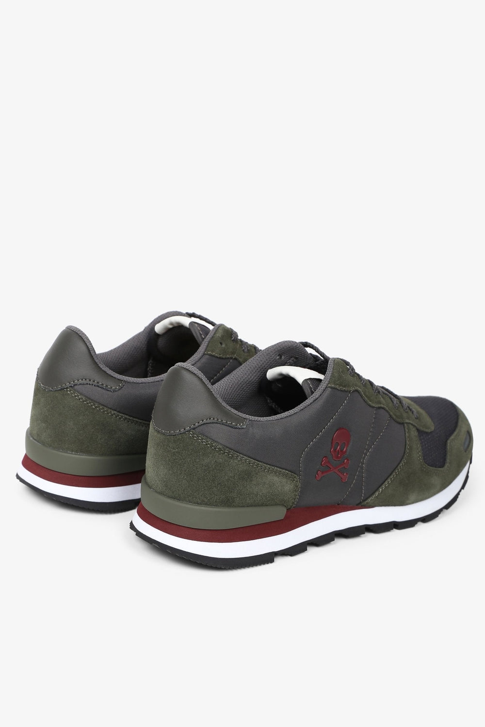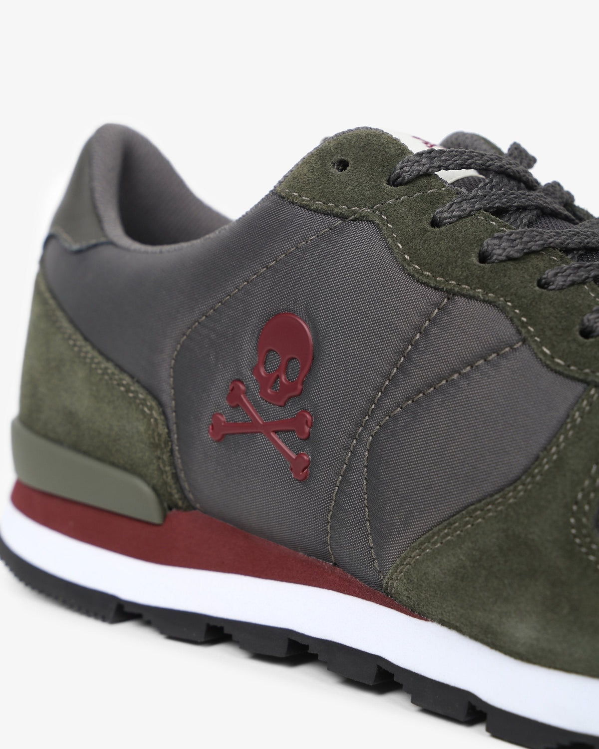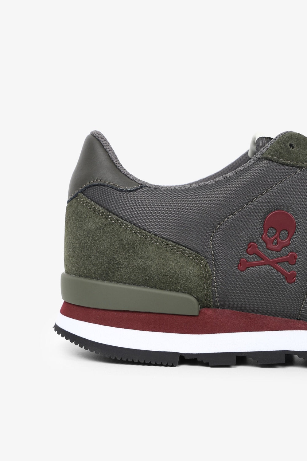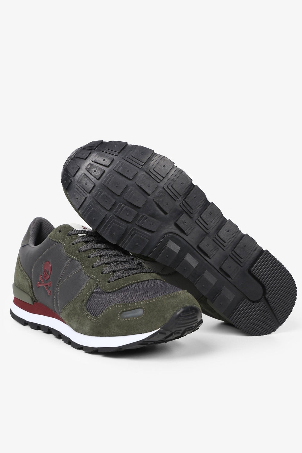 Zapatillas confeccionados en nylon y serraje. Cierre con cordones. Suela de goma y eva con estabilizador a contraste. Tejido transpirable de rejilla en pala, y calavera printeada en goma de alta densidad en el lateral.