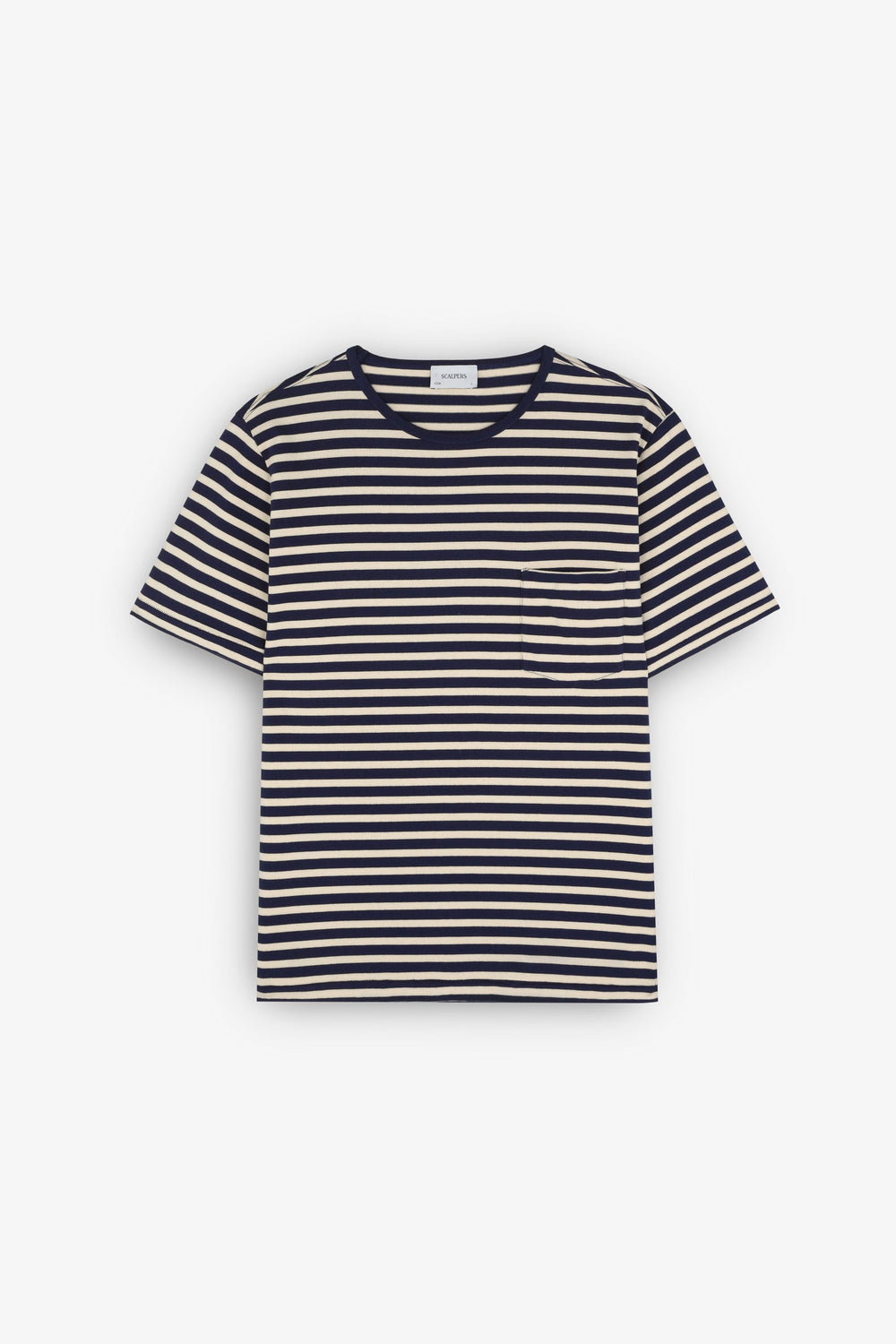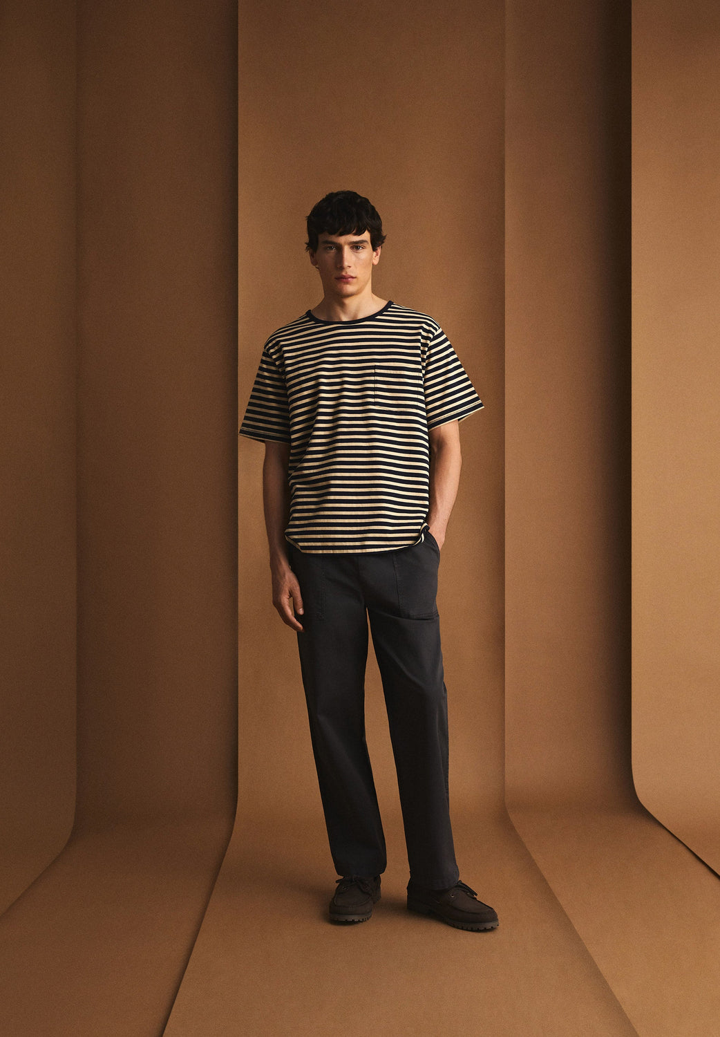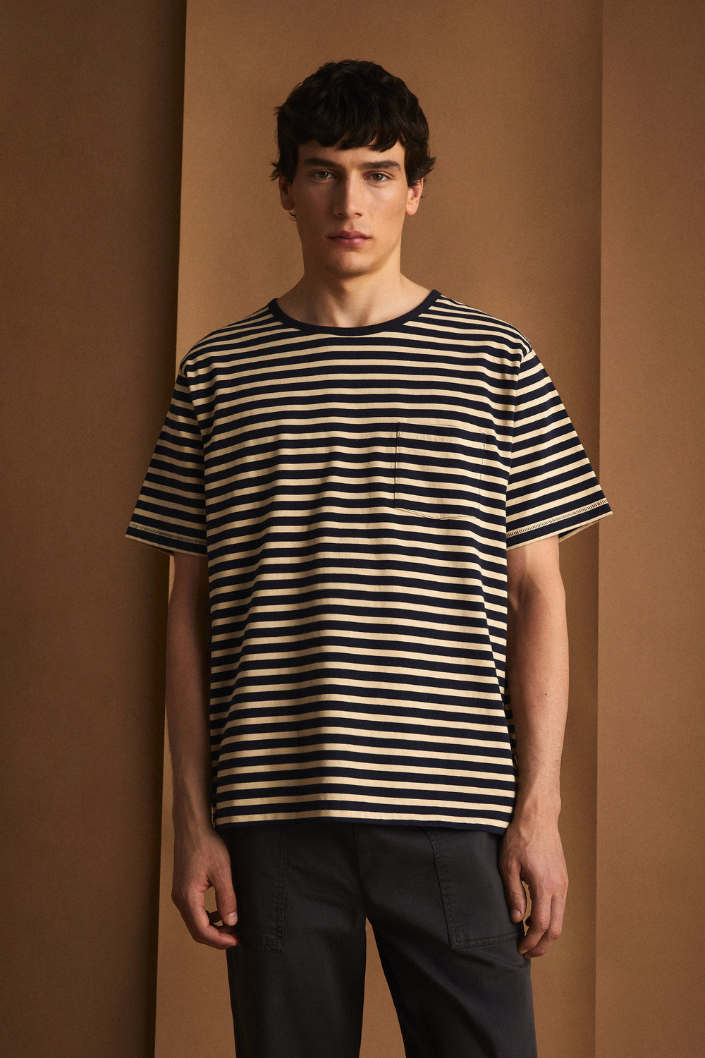Camiseta premium de rayas confeccionada en 100% algodón BCI. Relaxed fit, cuello redondo y manga corta. Bolsillo en pecho.
