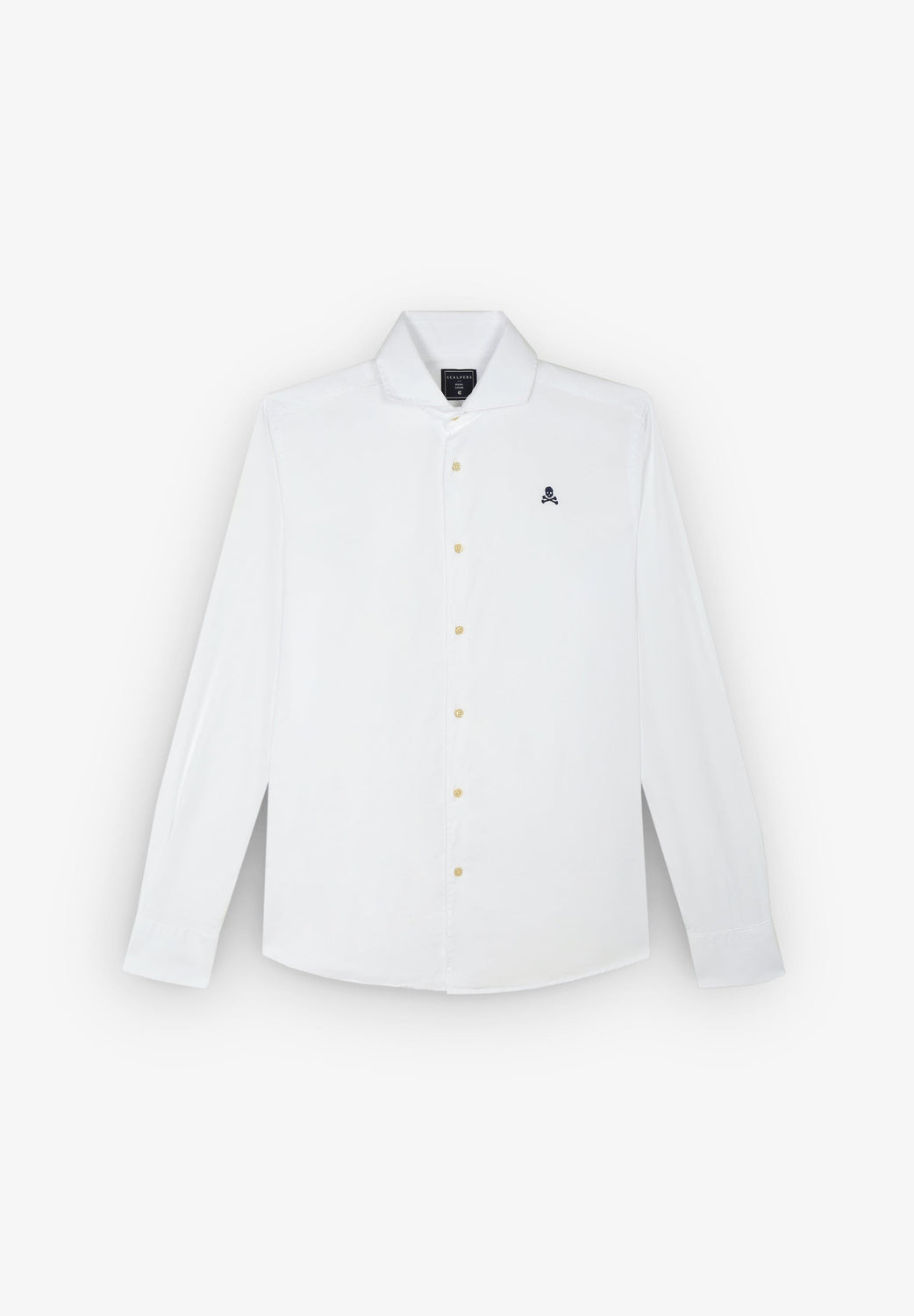 Camisa de vestir lisa. Confeccionada en tejido 100% algodón. Corte Regular Fit. Cuello cutaway. Cierre con botones. Manga larga terminada en puño simple. Detalle de calavera bordada en el pecho.