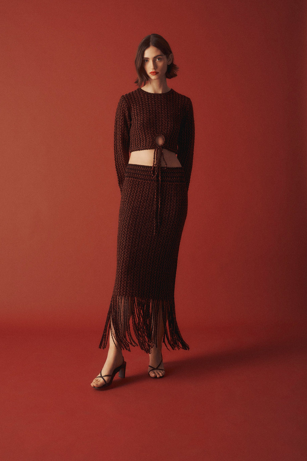 Falda midi de crochet. Slim fit, cinturilla elástica y bajo terminado en flecos.