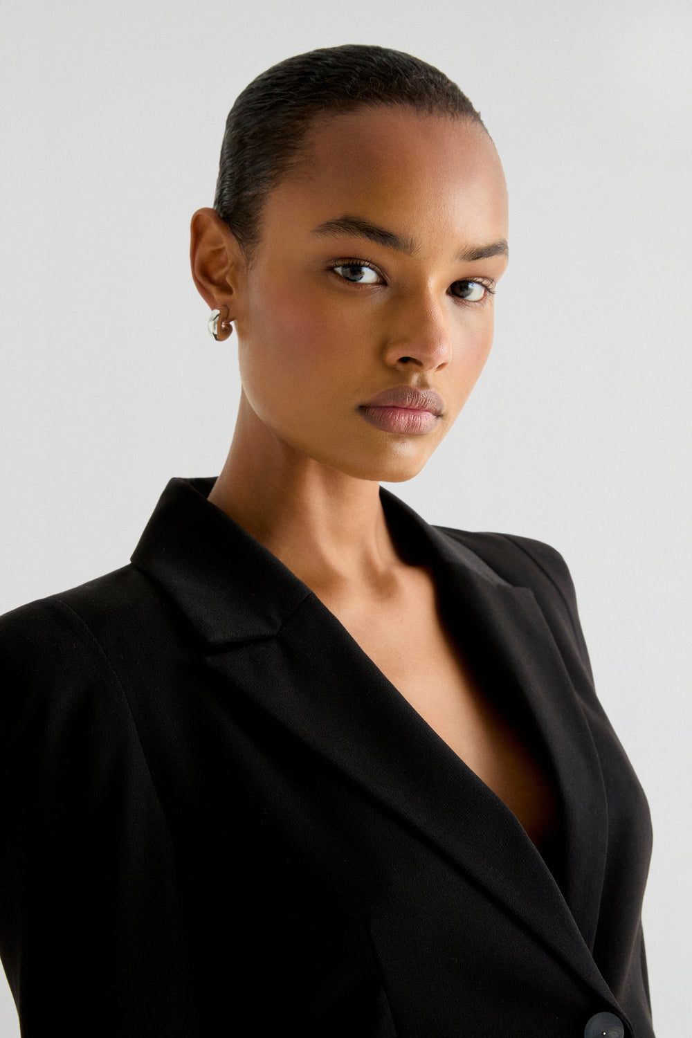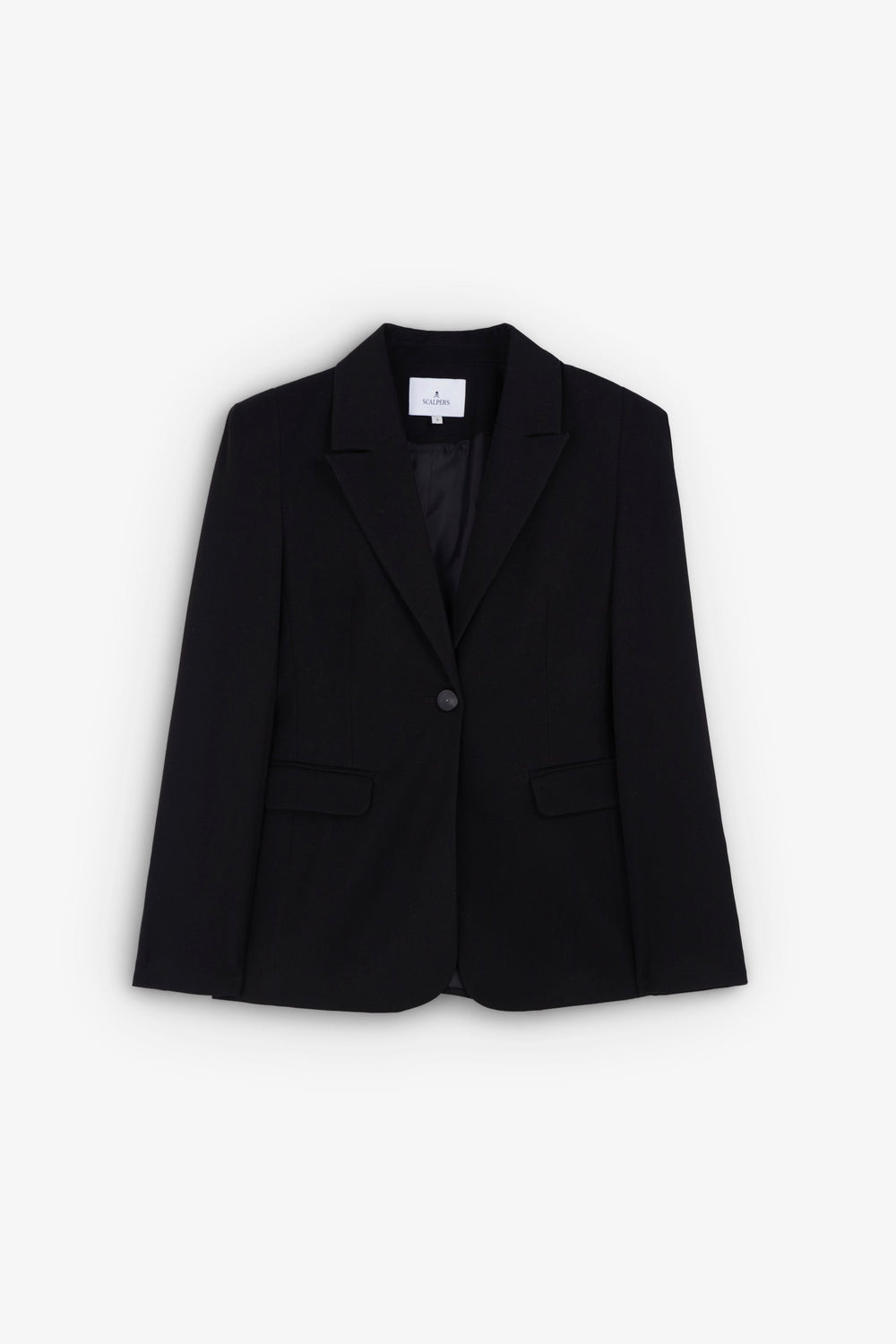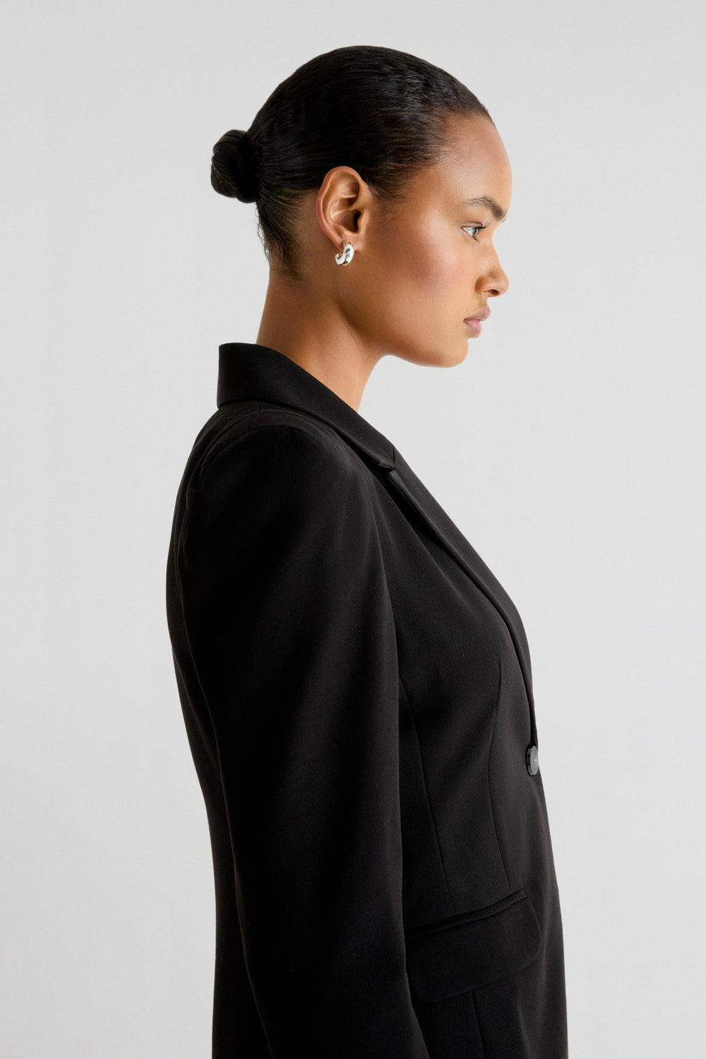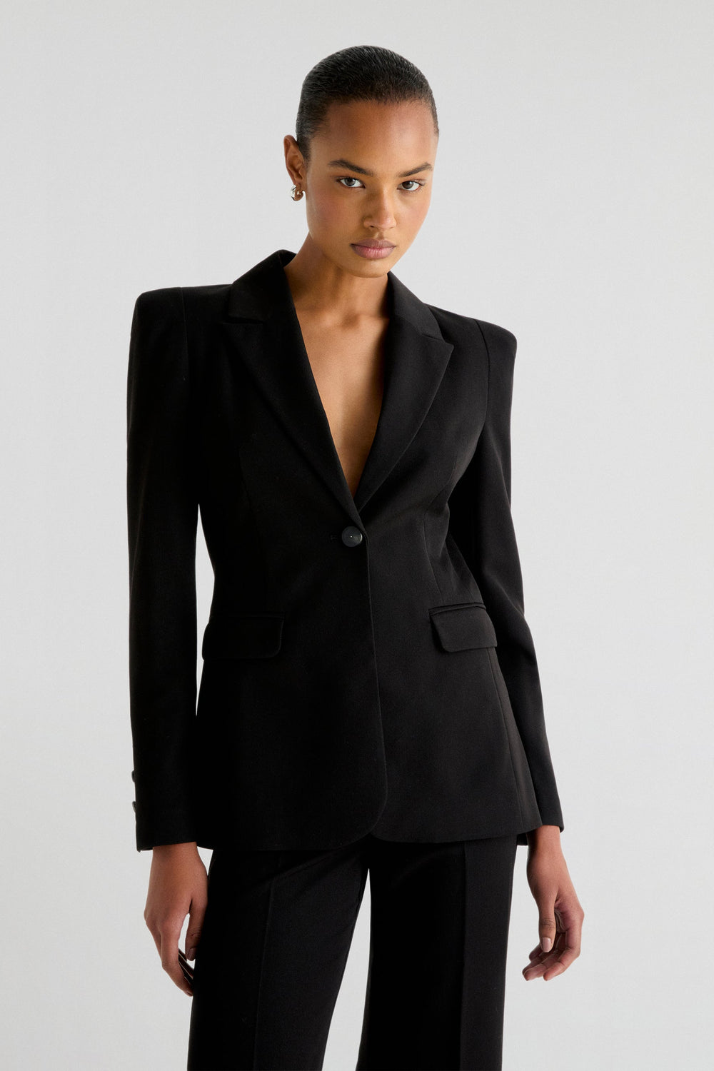 Blazer confeccionada tejido ligeramente elástico. Regular fit con hombreras, cuello con solapas y cierre con botón. Manga larga terminada en botones y bolsillos con solapa. Detalle de frunce en hombro.