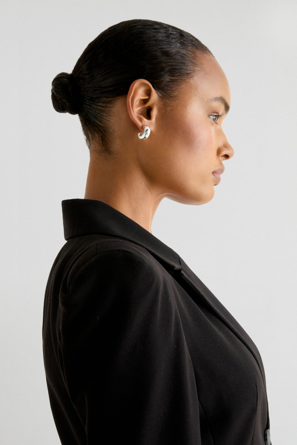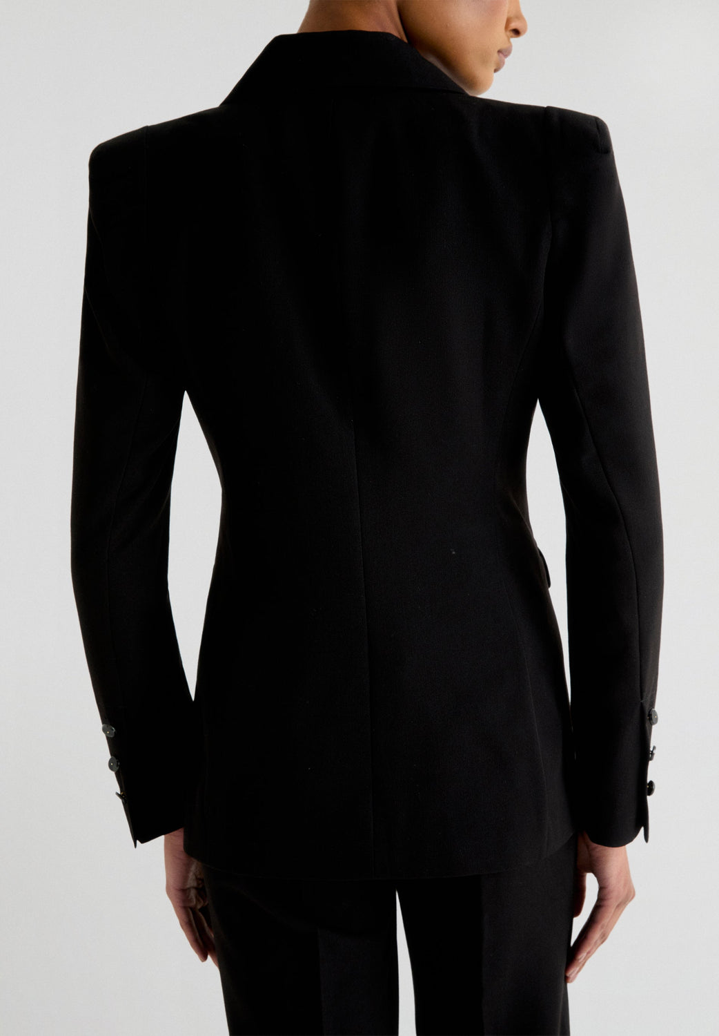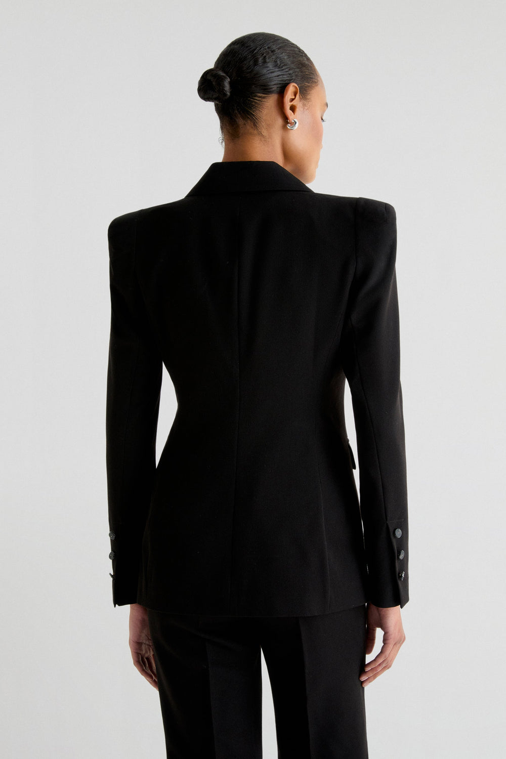 Blazer confeccionada tejido ligeramente elástico. Regular fit con hombreras, cuello con solapas y cierre con botón. Manga larga terminada en botones y bolsillos con solapa. Detalle de frunce en hombro.