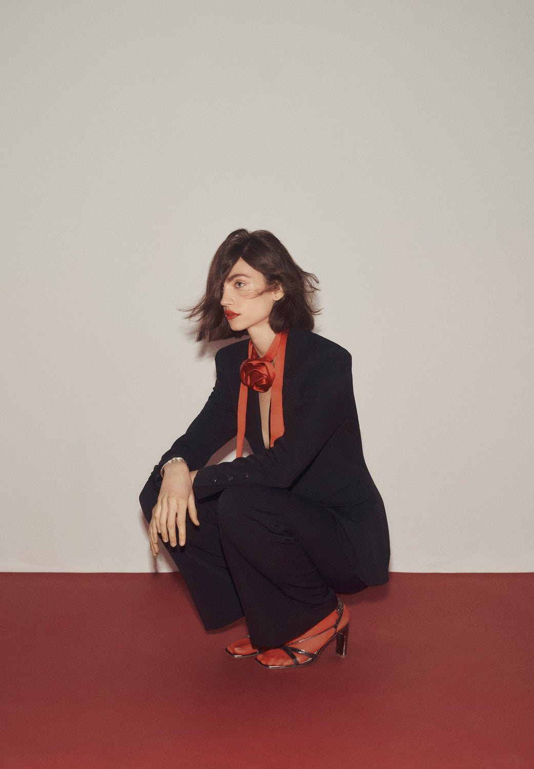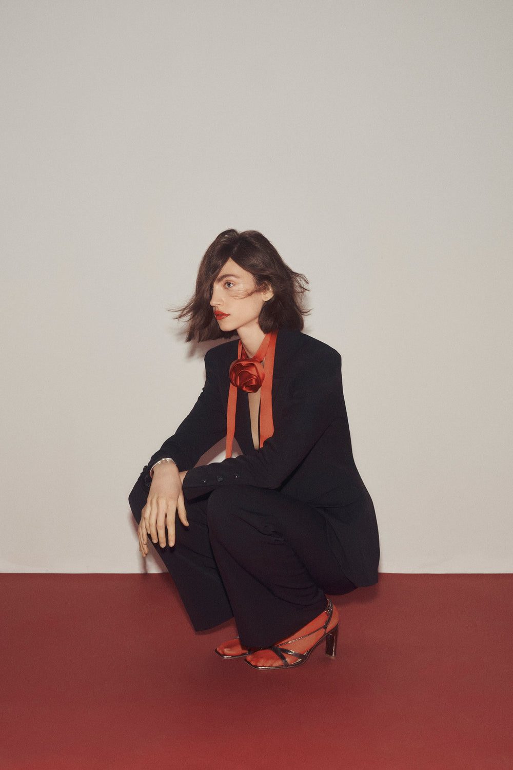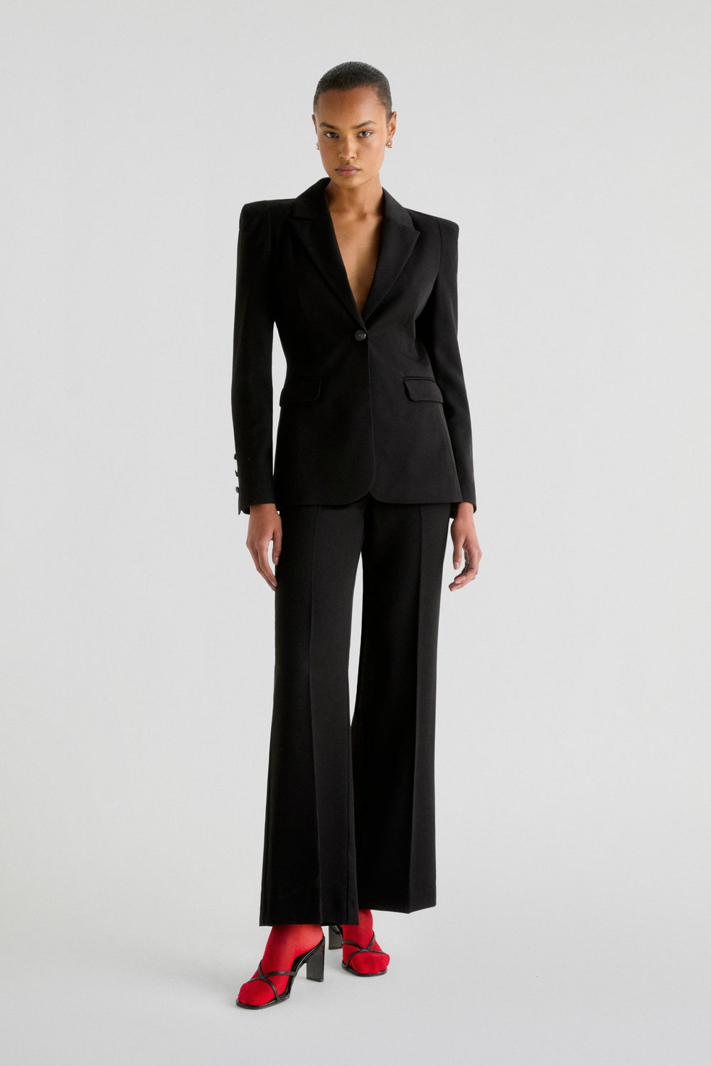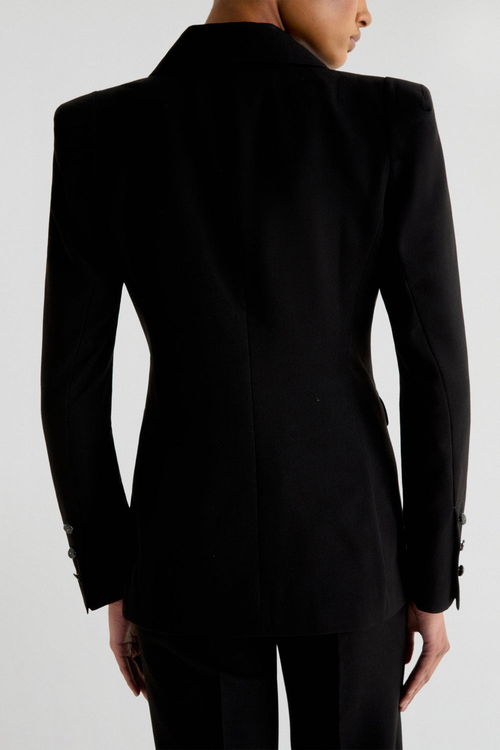 Blazer confeccionada tejido ligeramente elástico. Regular fit con hombreras, cuello con solapas y cierre con botón. Manga larga terminada en botones y bolsillos con solapa. Detalle de frunce en hombro.