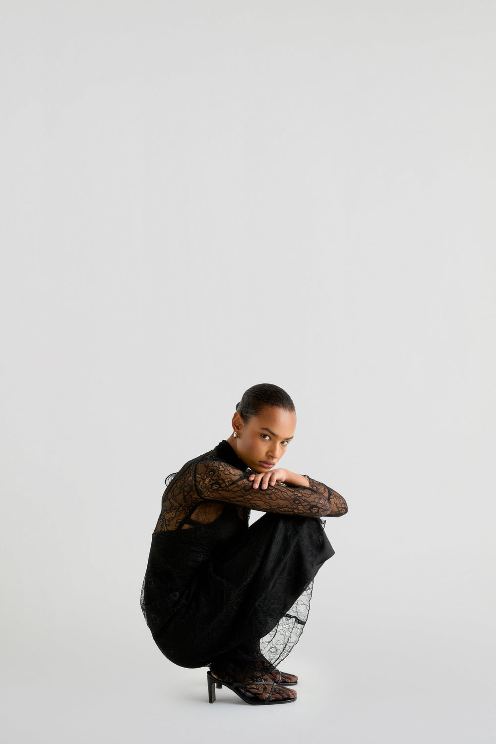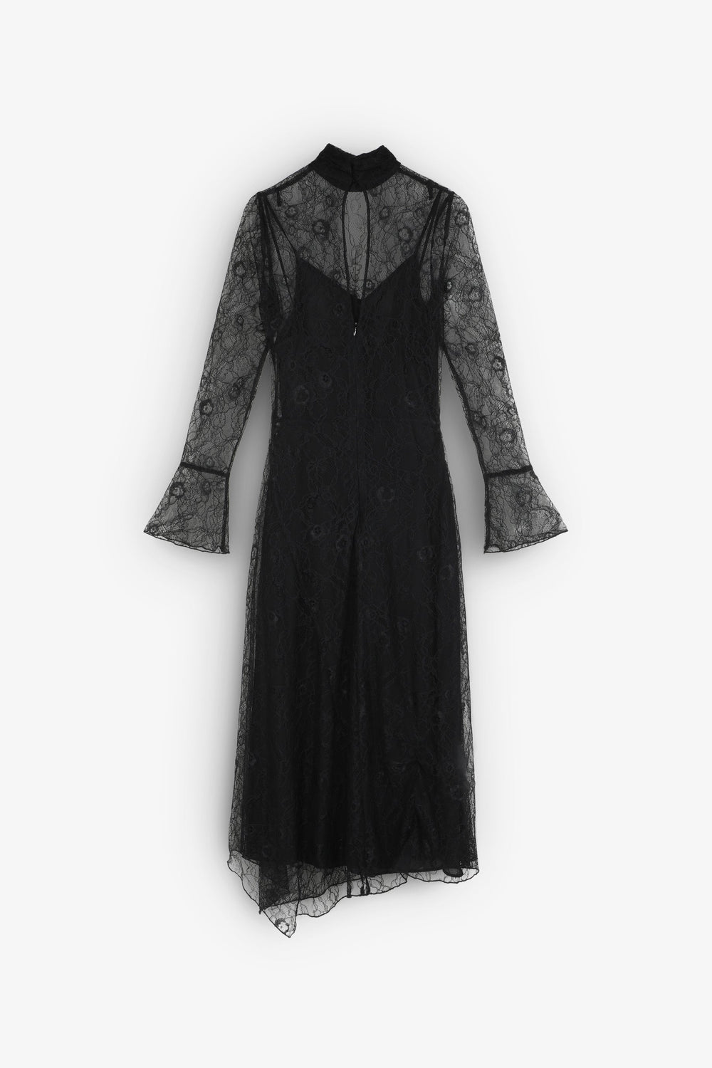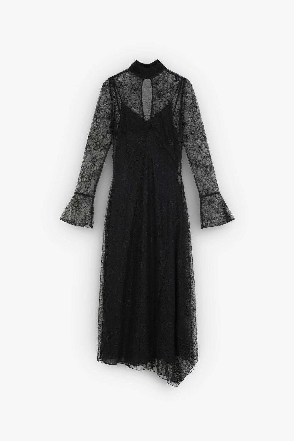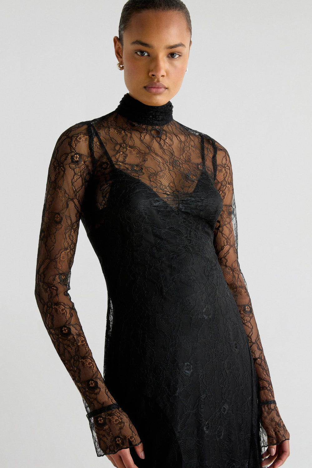 Vestido midi confeccionado en tejido de encaje. Slim fit, cuello subido y manga larga semitransparentes. Cierre con cremallera.