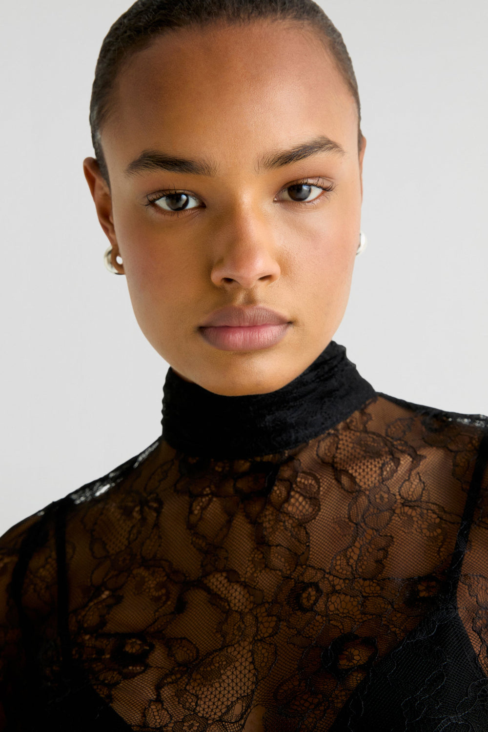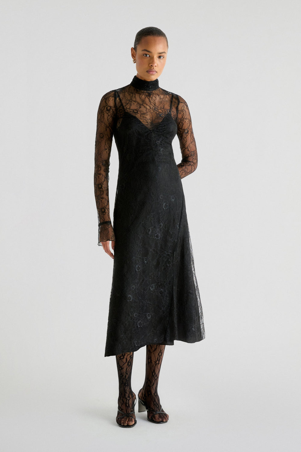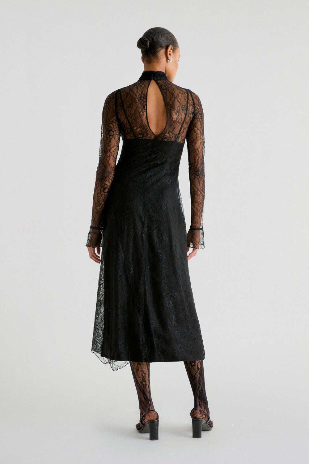 Vestido midi confeccionado en tejido de encaje. Slim fit, cuello subido y manga larga semitransparentes. Cierre con cremallera.