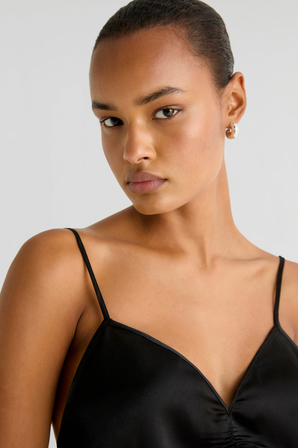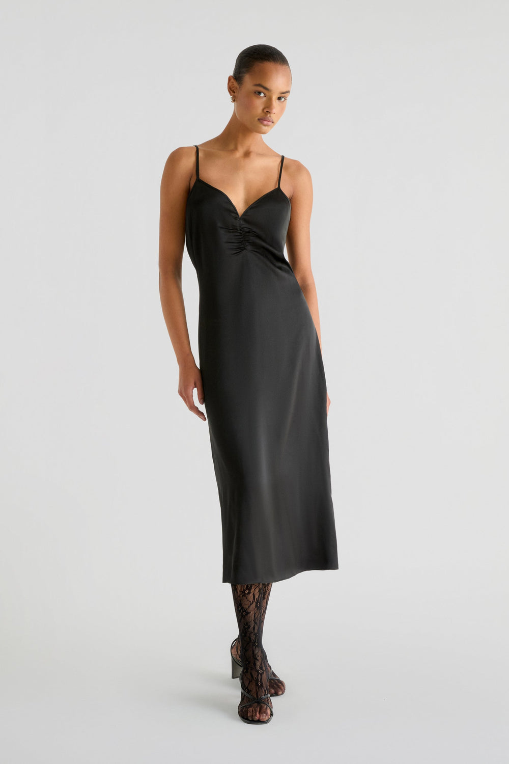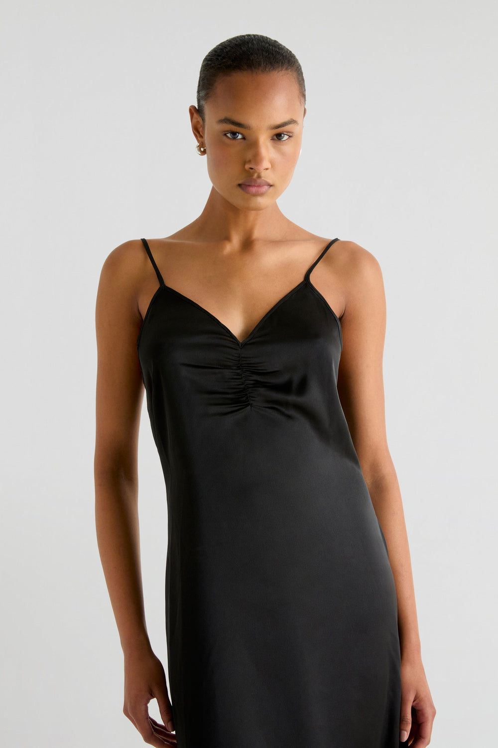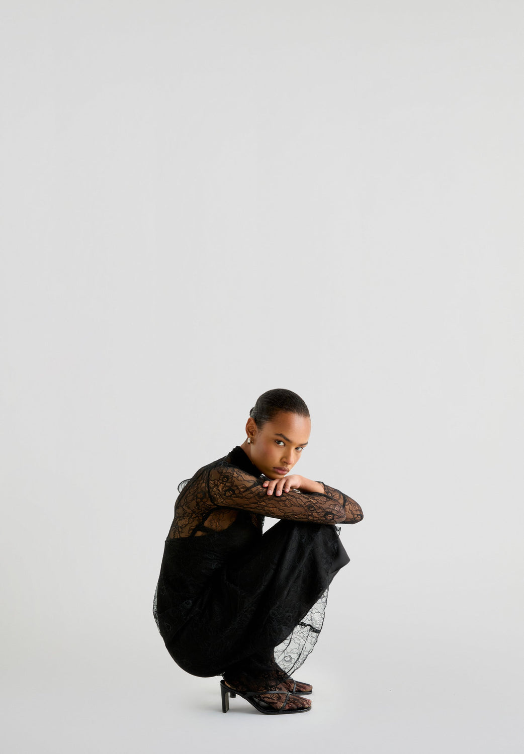 Vestido midi confeccionado en tejido de encaje. Slim fit, cuello subido y manga larga semitransparentes. Cierre con cremallera.