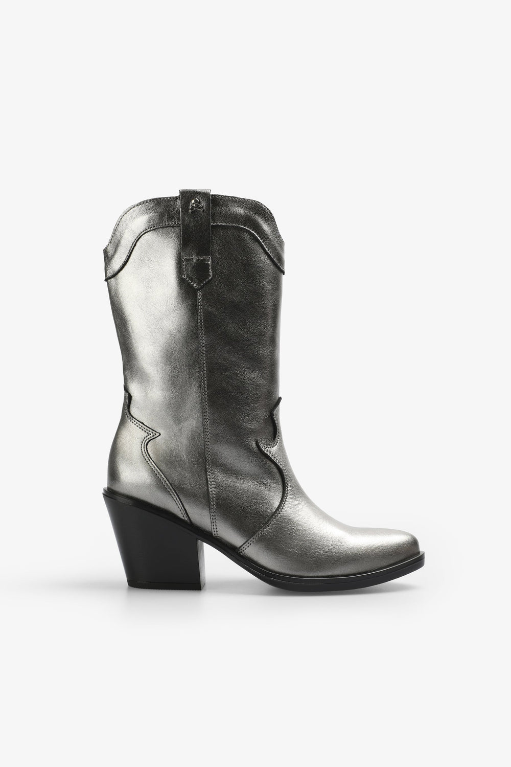 Botas tipo cowboy metalizadas confeccionadas en 100% piel. Caña media, tacón medio y tiradores laterales. Detalle de calavera metálica.