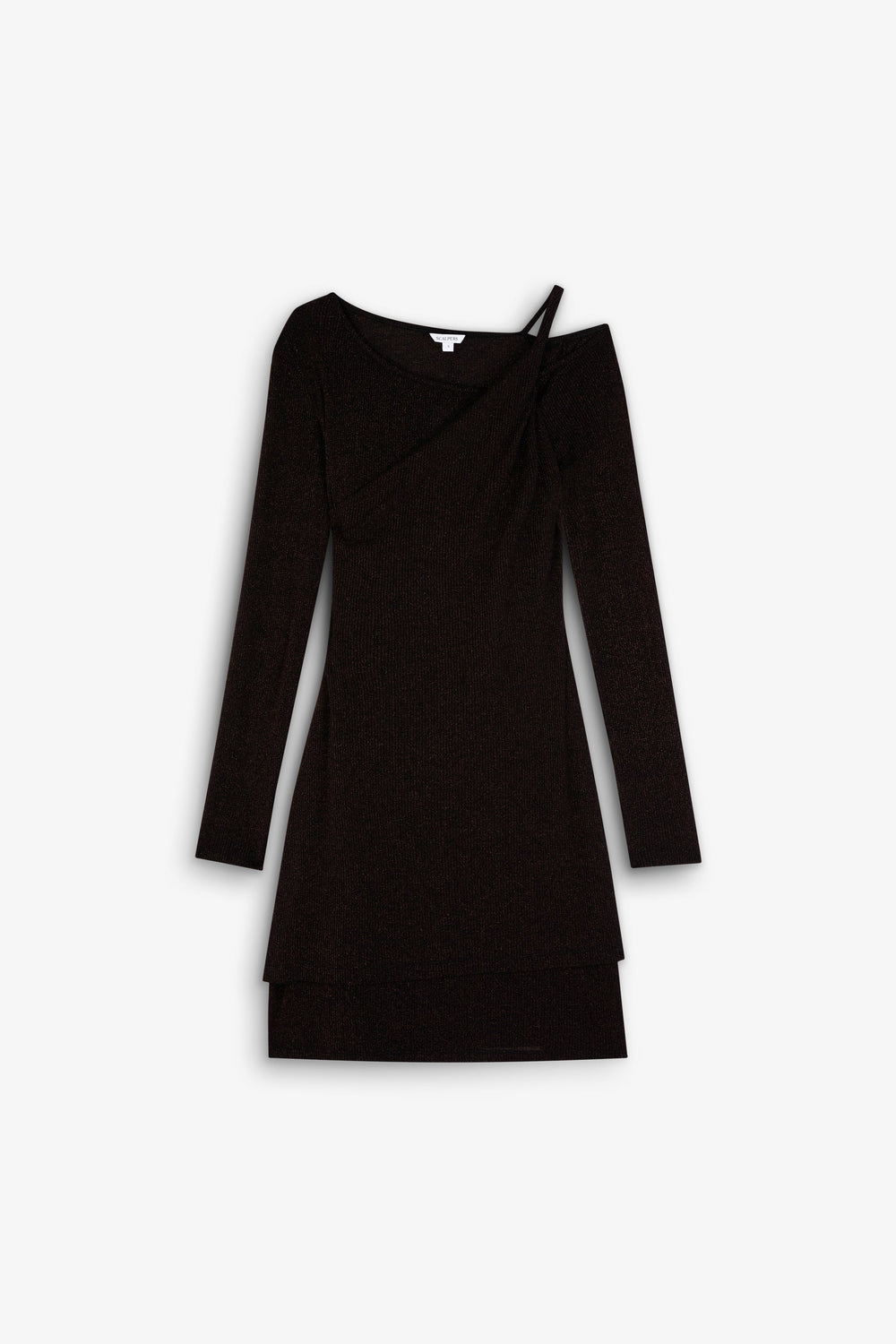 Vestido mini confeccionado en tejido de lurex. Slim fit, escote de barco con detalle de tira y manga larga. Detalle de doble tela en el bajo.